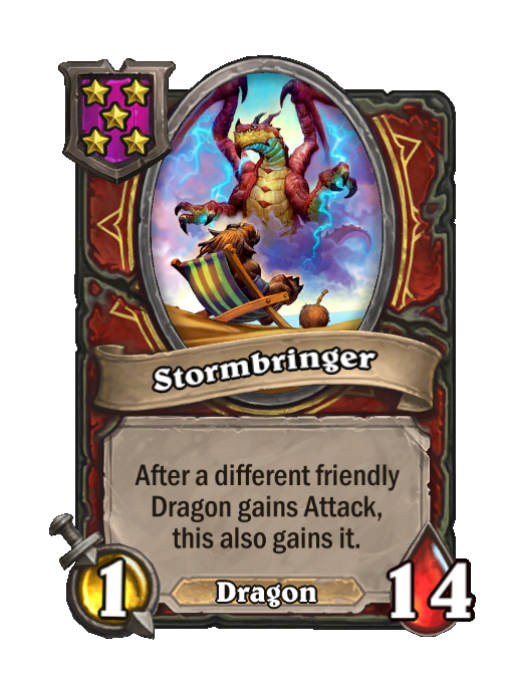Stormbringer is a Tier 5 Dragon Minion in Hearthstone Battlegrounds with 1/14 stats. Effect: After a different friendly Dragon gains Attack, this also gains it. This card is no longer in the pool (Legacy).