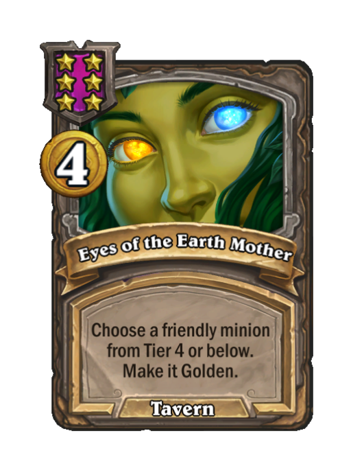 Eyes of the Earth Mother is a Tier 6 Spell in Hearthstone Battlegrounds (Tavern). Effect: Choose a friendly minion from Tier 4 or below. Make it Golden. Costs 4 Gold.