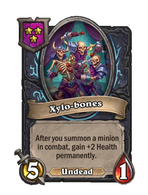 Xylo-bones is a Tier 3 Undead Minion in Hearthstone Battlegrounds with 5/1 stats. Effect: After you summon a minion in combat, gain +2 Health permanently. This card is no longer in the pool (Legacy).