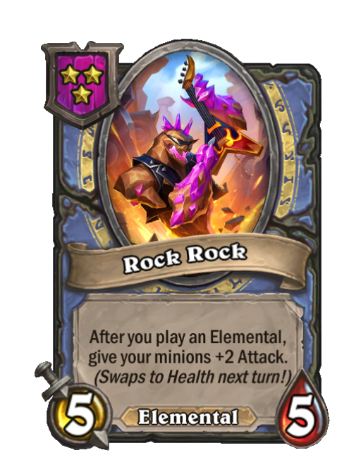 Rock Rock is a Tier 3 Elemental Minion in Hearthstone Battlegrounds with 5/5 stats. Effect: After you play an Elemental, give your minions +2 Attack. (Swaps to Health next turn!). This card is no longer in the pool (Legacy).