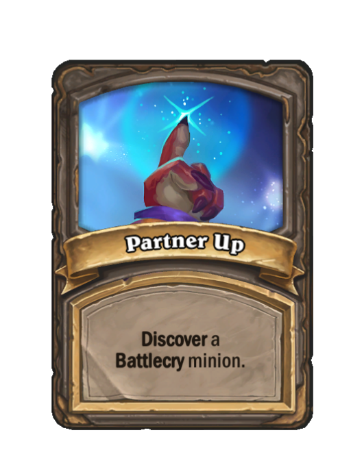 Partner Up is a Spell in Hearthstone Battlegrounds featuring Discover. Effect: Discover a Battlecry minion. Created by: Disco Shuffler. This card is no longer in the pool (Legacy).