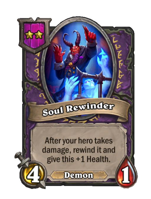 Soul Rewinder is a Tier 2 Demon Minion in Hearthstone Battlegrounds with 4/1 stats. Effect: After your hero takes damage, rewind it and give this +1 Health.