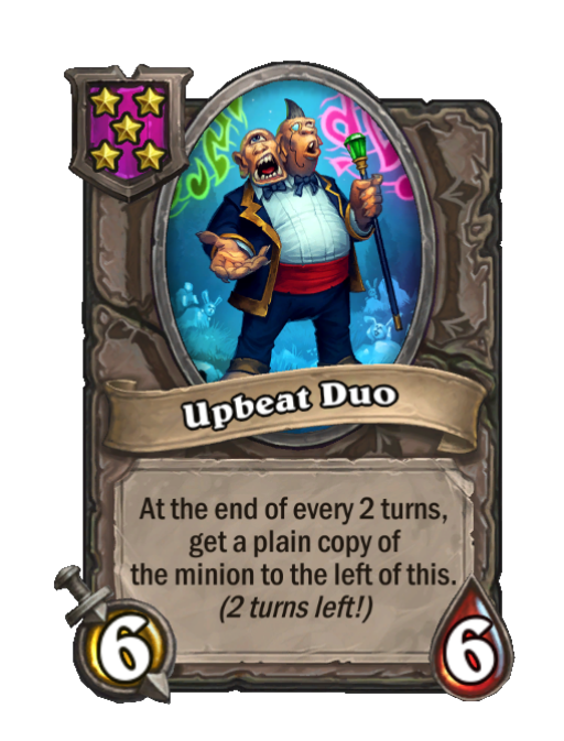 Upbeat Duo is a Tier 5 Minion in Hearthstone Battlegrounds with 6/6 stats. Effect: At the end of every 2 turns, get a plain copy of the minion to the left of this. (2 turns left!). This card is no longer in the pool (Legacy).