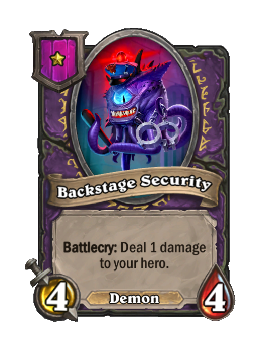 Backstage Security is a Tier 1 Demon Minion in Hearthstone Battlegrounds with 4/4 stats featuring Battlecry. Effect: Battlecry: Deal 1 damage to your hero. This card is no longer in the pool (Legacy).