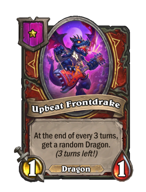 Upbeat Frontdrake is a Tier 1 Dragon Minion in Hearthstone Battlegrounds with 1/1 stats. Effect: At the end of every 3 turns, get a random Dragon. (3 turns left!). This card is no longer in the pool (Legacy).