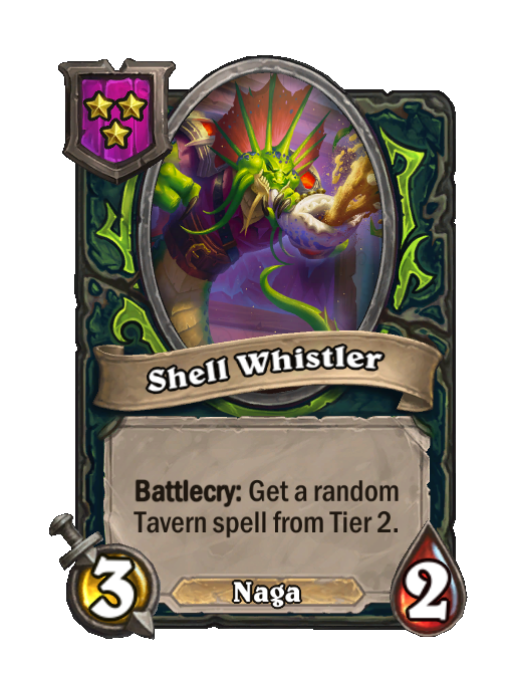 Shell Whistler is a Tier 3 Naga Minion in Hearthstone Battlegrounds with 3/2 stats featuring Battlecry. Effect: Battlecry: Get a random Tavern spell from Tier 2. This card is no longer in the pool (Legacy).