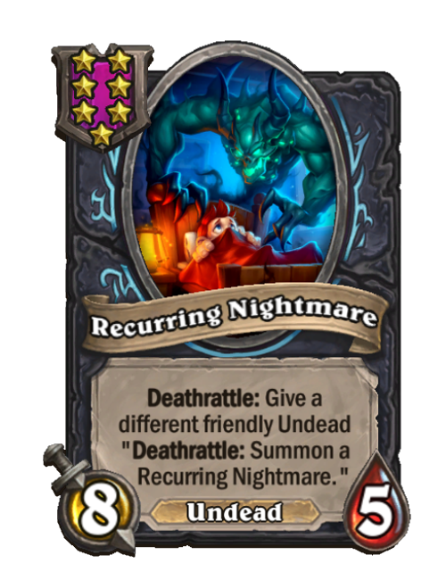 Recurring Nightmare is a Tier 7 Undead Minion in Hearthstone Battlegrounds with 8/5 stats featuring Deathrattle. Effect: Deathrattle: Give a different friendly Undead "Deathrattle: Summon a Recurring Nightmare.". This card is no longer in the pool (Legacy).