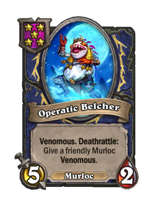 Operatic Belcher is a Tier 5 Murloc Minion in Hearthstone Battlegrounds with 5/2 stats featuring Deathrattle, Venomous. Effect: Venomous. Deathrattle: Give a friendly Murloc Venomous. This card is no longer in the pool (Legacy).