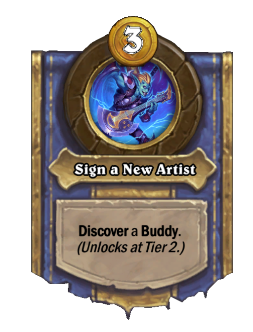 Sign a New Artist is a Hero Power in Hearthstone Battlegrounds featuring Discover. Effect: Discover a Buddy. (Unlocks at Tier 2.). Costs 3 Gold. Created by: E.T.C., Band Manager.
