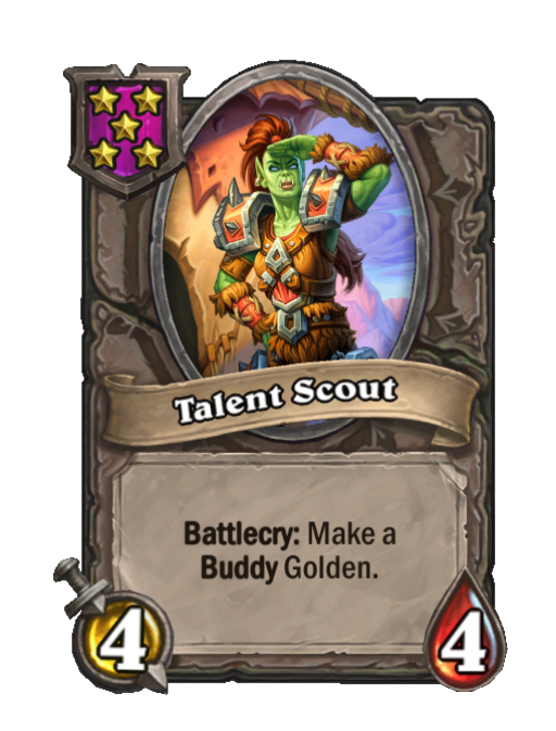 Talent Scout is a Tier 5 Minion in Hearthstone Battlegrounds with 4/4 stats featuring Battlecry. Effect: Battlecry: Make a Buddy Golden. Created by: E.T.C., Band Manager.