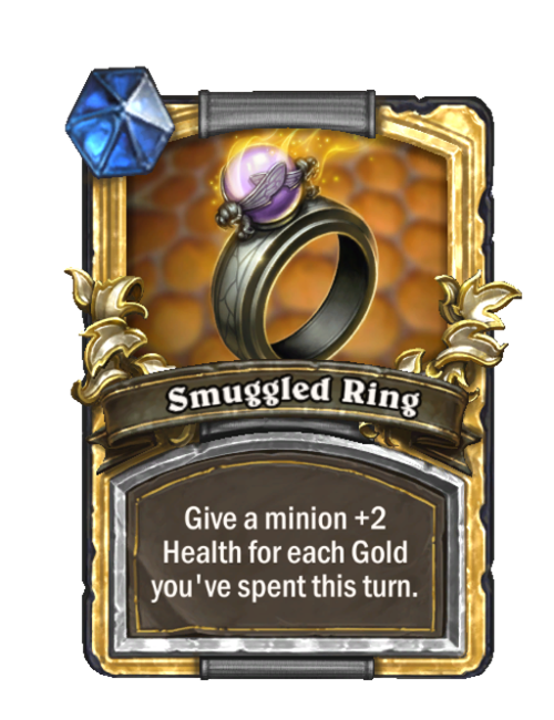 Smuggled Ring is a Spell in Hearthstone Battlegrounds. Effect: Give a minion +2 Health. (Improved by each Gold you've spent this turn!). Created by: Smuggled Ring. This card is no longer in the pool (Legacy).