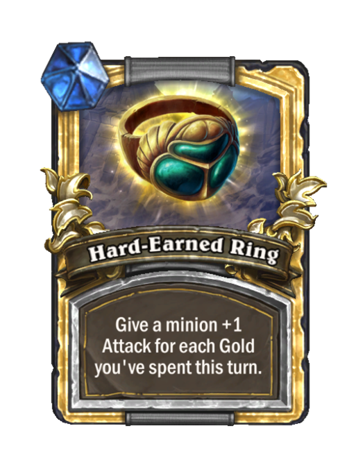 Hard-Earned Ring is a Spell in Hearthstone Battlegrounds. Effect: Give a minion +1 Attack. (Improved by each Gold you've spent this turn!). This card is no longer in the pool (Legacy).