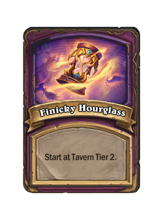 Finicky Hourglass is a Anomaly in Hearthstone Battlegrounds. Effect: Start at Tavern Tier 2. This card is no longer in the pool (Legacy).