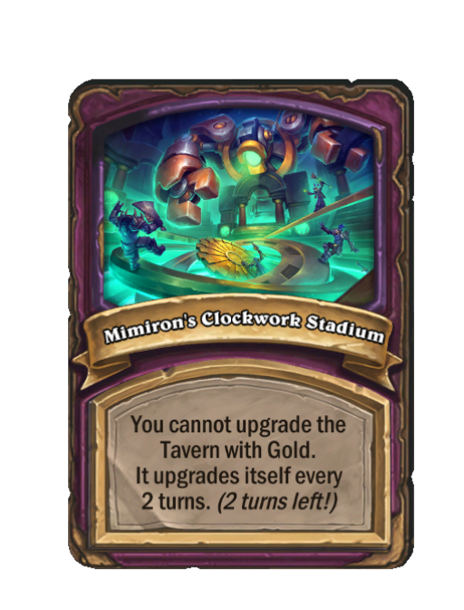 Mimiron's Clockwork Stadium is a Anomaly in Hearthstone Battlegrounds. Effect: You cannot upgrade the Tavern with Gold. It upgrades itself every 2 turns. (2 turns left!). This card is no longer in the pool (Legacy).