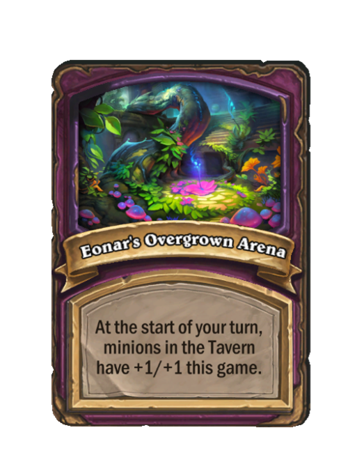 Eonar's Overgrown Arena is a Anomaly in Hearthstone Battlegrounds. Effect: At the start of your turn, minions in the Tavern have +1/+1 this game. This card is no longer in the pool (Legacy).