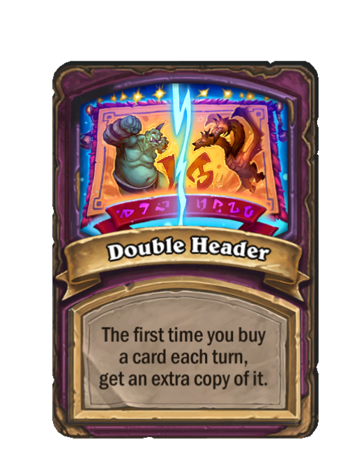 Double Header is a Anomaly in Hearthstone Battlegrounds. Effect: The first time you buy a card each turn, get an extra copy of it.