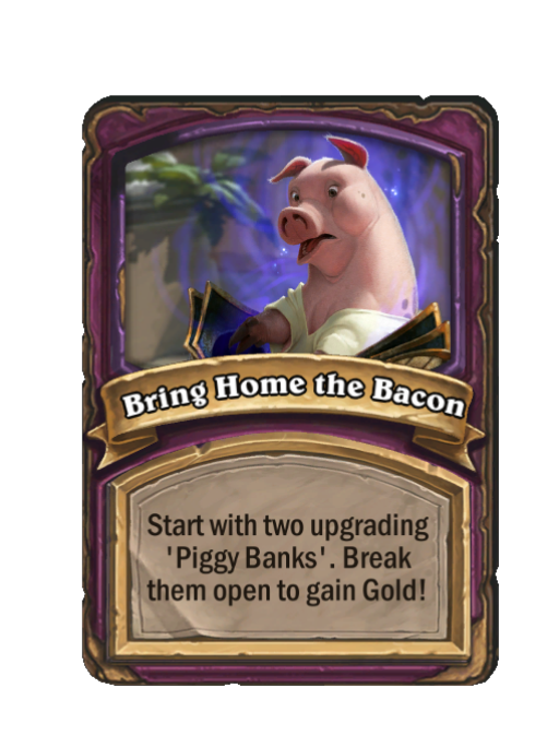 Bring Home the Bacon is a Anomaly in Hearthstone Battlegrounds. Effect: Start with two upgrading 'Piggy Banks'. Break them open to gain Gold!.