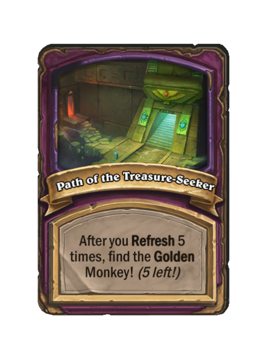 Path of the Treasure-Seeker is a Anomaly in Hearthstone Battlegrounds. Effect: After you Refresh 5 times, find the Golden Monkey! (5 left!). This card is no longer in the pool (Legacy).