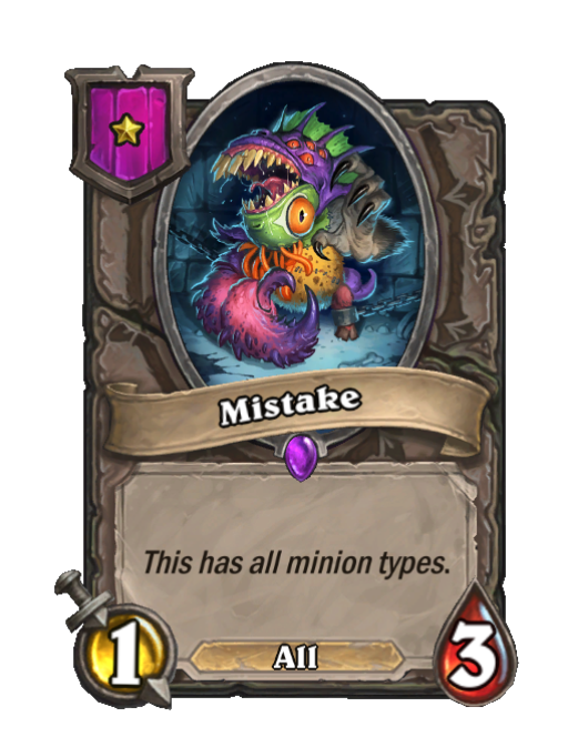 Mistake is a Tier 1 All Minion in Hearthstone Battlegrounds with 1/3 stats. Effect: This has all minion types. This card is no longer in the pool (Legacy).