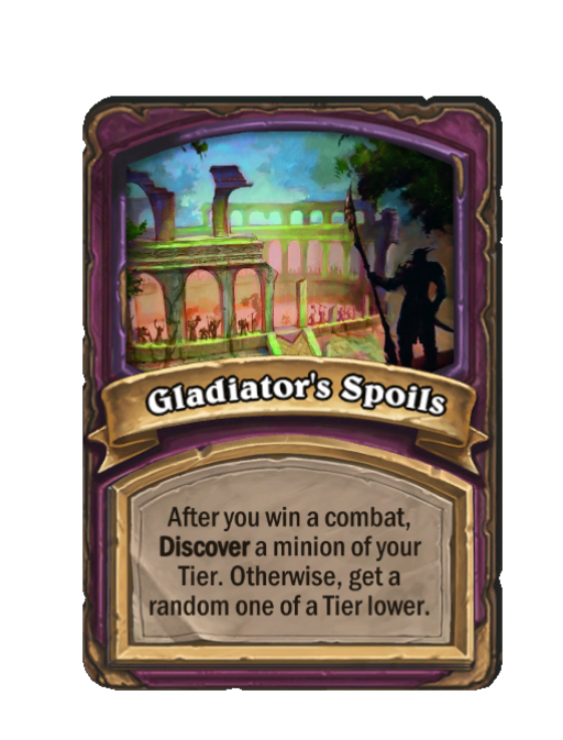 Gladiator's Spoils is a Anomaly in Hearthstone Battlegrounds featuring Discover. Effect: After you win a combat, Discover a minion of your Tier. Otherwise, get a random one of a Tier lower. This card is no longer in the pool (Legacy).