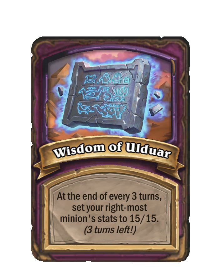 Wisdom of Ulduar is a Anomaly in Hearthstone Battlegrounds. Effect: At the end of every 3 turns, set your right-most minion's stats to 15/15. (3 turns left!). This card is no longer in the pool (Legacy).