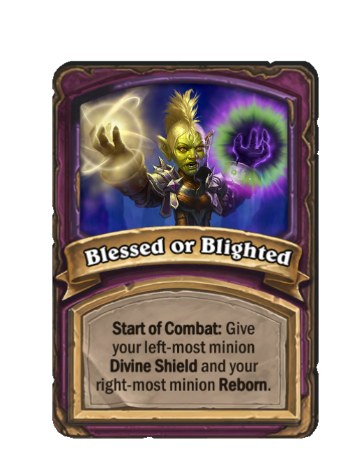 Blessed or Blighted is a Anomaly in Hearthstone Battlegrounds featuring Start of Combat. Effect: Start of Combat: Give your left-most minion Divine Shield and your right-most minion Reborn. This card is no longer in the pool (Legacy).