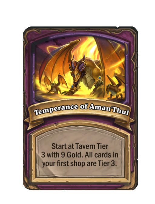 Temperance of Aman'Thul is a Anomaly in Hearthstone Battlegrounds. Effect: Start at Tavern Tier 3 with 9 Gold. All cards in your first shop are Tier 3. This card is no longer in the pool (Legacy).