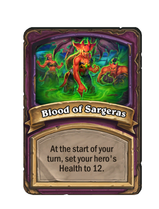 Blood of Sargeras is a Anomaly in Hearthstone Battlegrounds. Effect: At the start of your turn, set your hero's Health to 12. This card is no longer in the pool (Legacy).