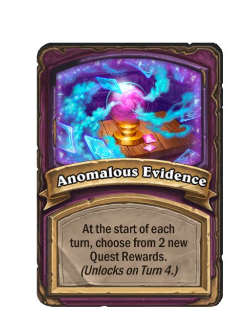 Anomalous Evidence is a Anomaly in Hearthstone Battlegrounds featuring Start of Turn. Effect: At the start of each turn, choose from 2 new Quest Rewards. (Unlocks on Turn 4.). This card is no longer in the pool (Legacy).