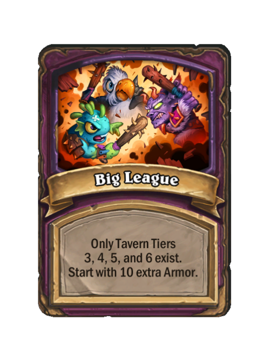 Big League is a Anomaly in Hearthstone Battlegrounds. Effect: Only Tavern Tiers 3, 4, 5, and 6 exist. Start with 10 extra Armor. This card is no longer in the pool (Legacy).