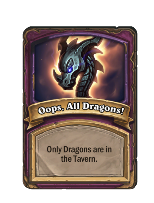 Oops, All Dragons! is a Anomaly in Hearthstone Battlegrounds. Effect: Only Dragons are in the Tavern. This card is no longer in the pool (Legacy).