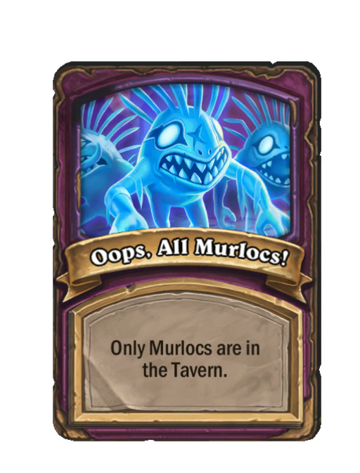 Oops, All Murlocs! is a Anomaly in Hearthstone Battlegrounds. Effect: Only Murlocs are in the Tavern. This card is no longer in the pool (Legacy).
