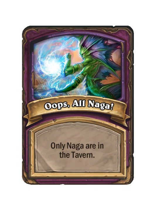 Oops, All Naga! is a Anomaly in Hearthstone Battlegrounds. Effect: Only Naga are in the Tavern. This card is no longer in the pool (Legacy).