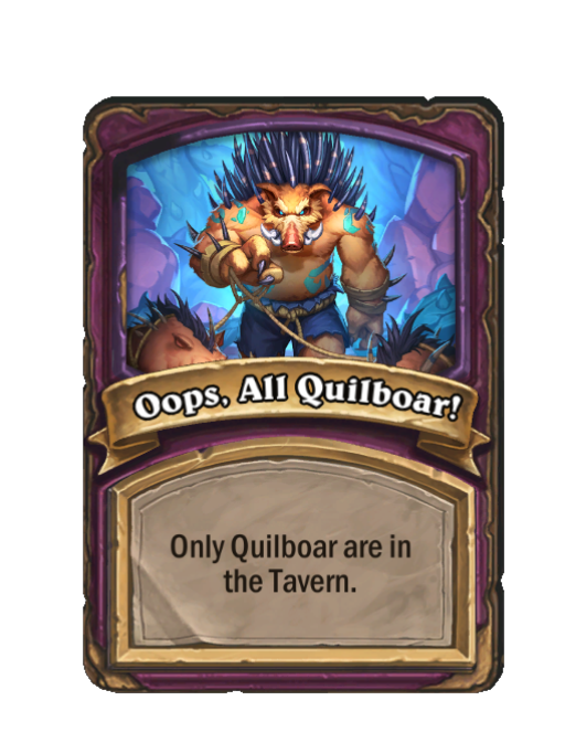 Oops, All Quilboar! is a Anomaly in Hearthstone Battlegrounds. Effect: Only Quilboar are in the Tavern. This card is no longer in the pool (Legacy).