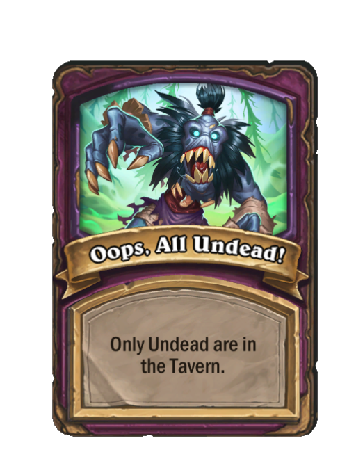 Oops, All Undead! is a Anomaly in Hearthstone Battlegrounds. Effect: Only Undead are in the Tavern. This card is no longer in the pool (Legacy).