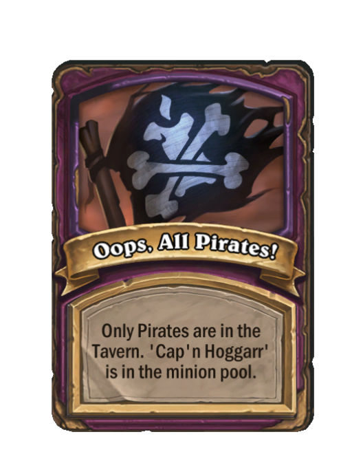 Oops, All Pirates! is a Anomaly in Hearthstone Battlegrounds. Effect: Only Pirates are in the Tavern. 'Cap'n Hoggarr' is in the minion pool. This card is no longer in the pool (Legacy).
