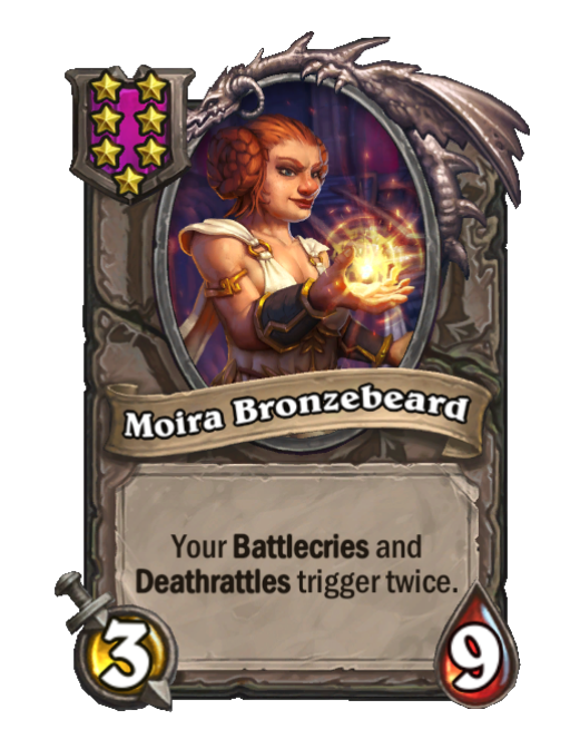 Moira Bronzebeard is a Tier 7 Minion in Hearthstone Battlegrounds with 3/9 stats featuring Aura. Effect: Your Battlecries and Deathrattles trigger twice. This card is no longer in the pool (Legacy).