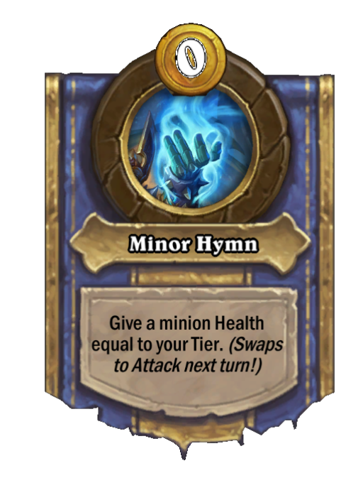 Minor Hymn is a Hero Power in Hearthstone Battlegrounds. Effect: Give a minion Health equal to your Tier. (Swaps to Attack next turn!). Created by: Major Hymn.