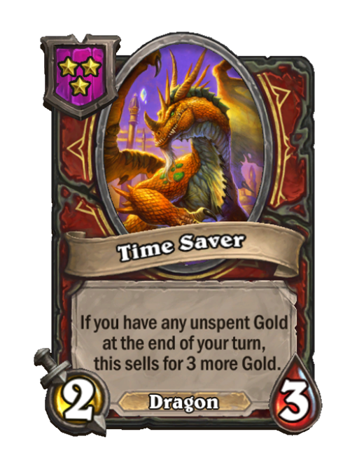 Time Saver is a Tier 3 Dragon Minion in Hearthstone Battlegrounds with 2/3 stats. Effect: If you have any unspent Gold at the end of your turn, this sells for 3 more Gold. This card is no longer in the pool (Legacy).
