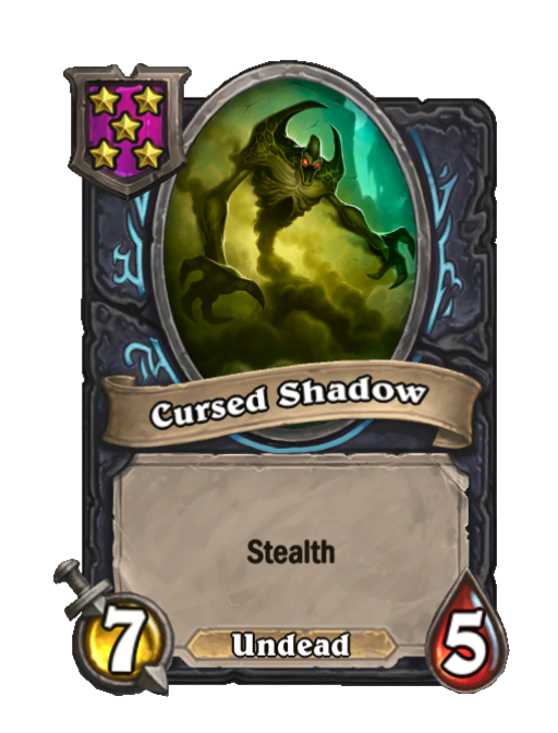 Cursed Shadow is a Tier 5 Undead Minion in Hearthstone Battlegrounds with 7/5 stats featuring Stealth. Effect: Stealth. This card is no longer in the pool (Legacy).