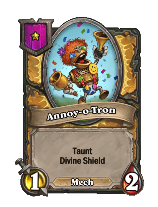 Annoy-o-Tron is a Tier 1 Mech Minion in Hearthstone Battlegrounds with 1/2 stats featuring Taunt, Divine Shield. Effect: Taunt Divine Shield.