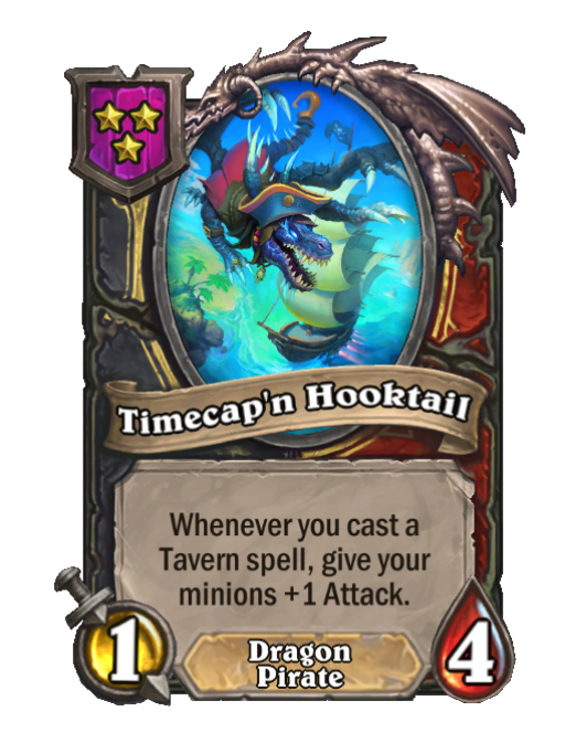 Timecap'n Hooktail is a Tier 3 Dragon/Pirate Minion in Hearthstone Battlegrounds with 1/4 stats. Effect: Whenever you cast a Tavern spell, give your minions +1 Attack.