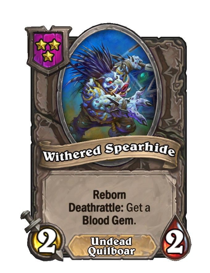 Withered Spearhide is a Tier 3 Quilboar/Undead Minion in Hearthstone Battlegrounds with 2/2 stats featuring Reborn, Deathrattle. Effect: Reborn Deathrattle: Get a Blood Gem. This card is no longer in the pool (Legacy).