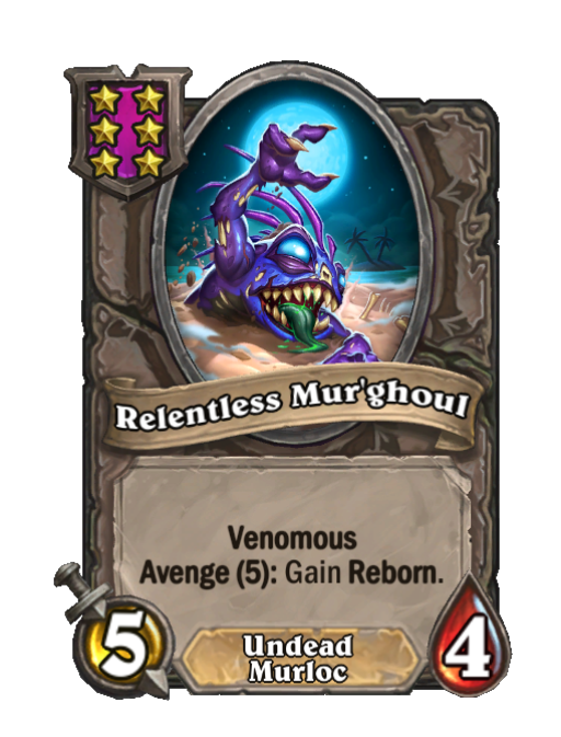Relentless Mur'ghoul is a Tier 6 Undead/Murloc Minion in Hearthstone Battlegrounds with 5/4 stats featuring Venomous, Avenge. Effect: Venomous Avenge (5): Gain Reborn. This card is no longer in the pool (Legacy).