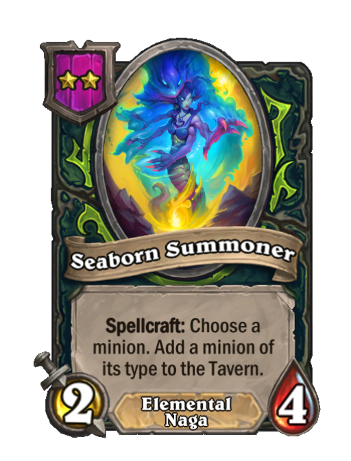 Seaborn Summoner is a Tier 2 Elemental/Naga Minion in Hearthstone Battlegrounds with 2/4 stats featuring Spellcraft. Effect: Spellcraft: Choose a minion. Add a minion of its type to the Tavern. This card is no longer in the pool (Legacy).