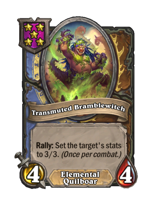 Transmuted Bramblewitch is a Tier 5 Elemental/Quilboar Minion in Hearthstone Battlegrounds with 4/4 stats featuring Rally. Effect: Rally: Set the target's stats to 3/3. (Once per combat.). This card is no longer in the pool (Legacy).