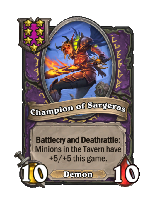 Champion of Sargeras is a Tier 7 Demon Minion in Hearthstone Battlegrounds with 10/10 stats featuring Deathrattle, Battlecry. Effect: Battlecry and Deathrattle: Minions in the Tavern have +5/+5 this game.