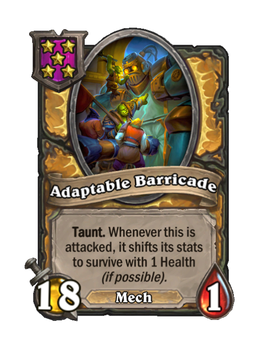 Adaptable Barricade is a Tier 5 Mech Minion in Hearthstone Battlegrounds with 18/1 stats featuring Taunt. Effect: Taunt. Whenever this is attacked, it shifts its stats to survive with 1_Health (if possible). This card is no longer in the pool (Legacy).
