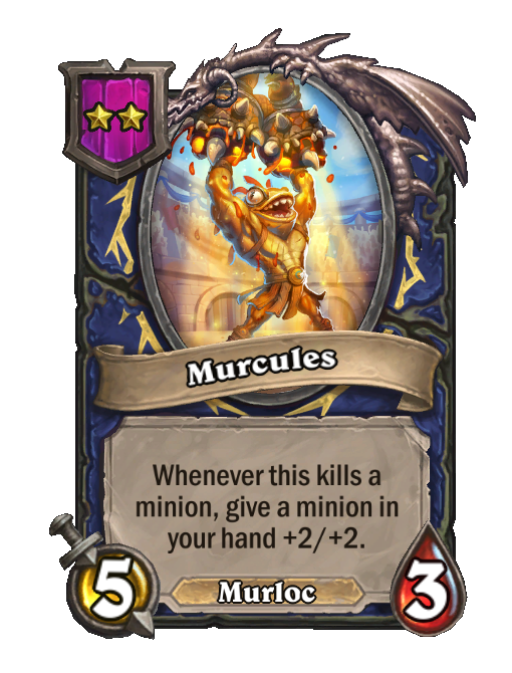 Murcules is a Tier 2 Murloc Minion in Hearthstone Battlegrounds with 5/3 stats. Effect: Whenever this kills a minion, give a minion in your hand +2/+2. This card is no longer in the pool (Legacy).
