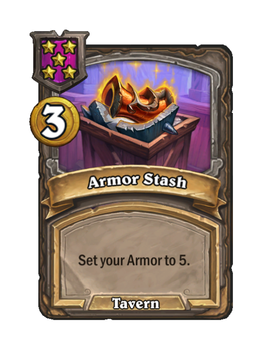 Armor Stash is a Tier 5 Spell in Hearthstone Battlegrounds (Tavern). Effect: Set your Armor to 5. Costs 3 Gold.